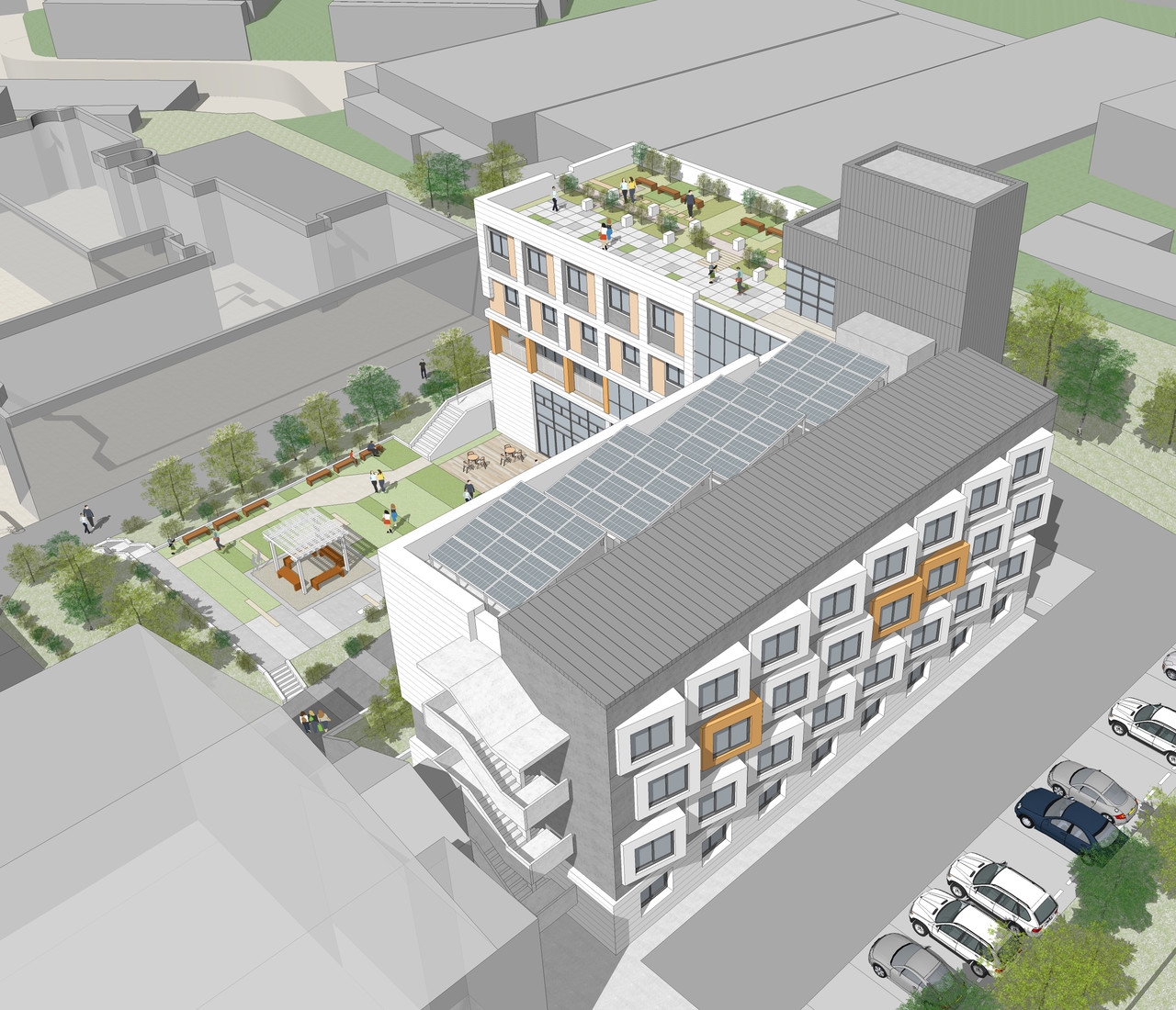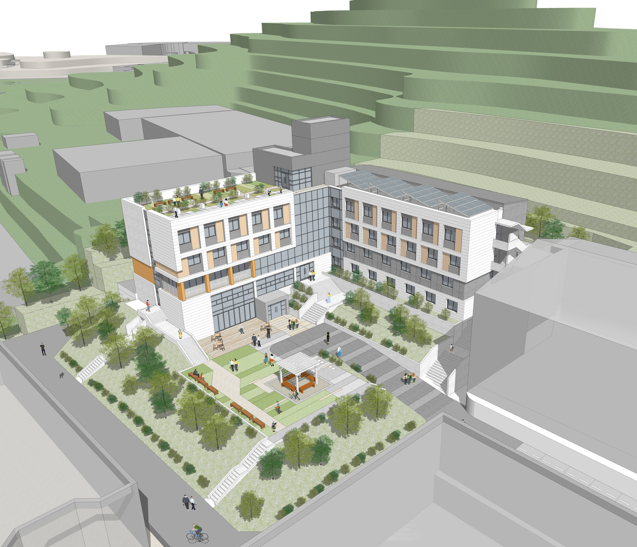 공장소음이 면한 곳을 비우고 배치된 커뮤니티 공간은 휴게마당부터 옥상정원까지 이어지는